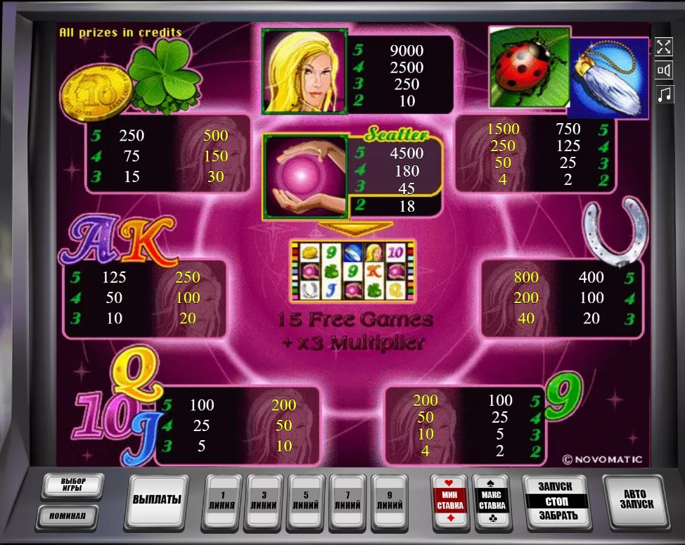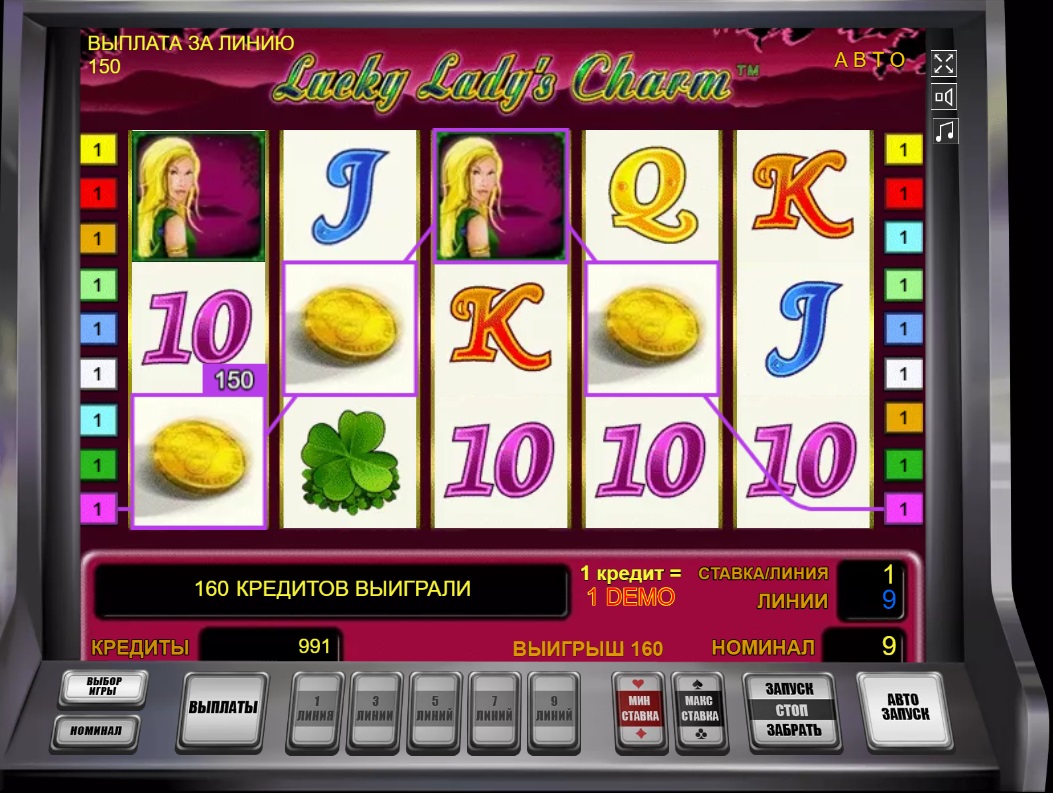 Игровой автомат Lucky Lady’s Charm — творение всемирно известного бренда Novomatic. Это игровой автомат с дополнительными играми, 5 барабанами и 9 активными линиями. В слоте имеются особые значки, символизирующие удачу: магические шары, заячьи лапки, божьи коровки. В онлайн-автомат можно играть как бесплатно в демо версии, так и на настоящие деньги.