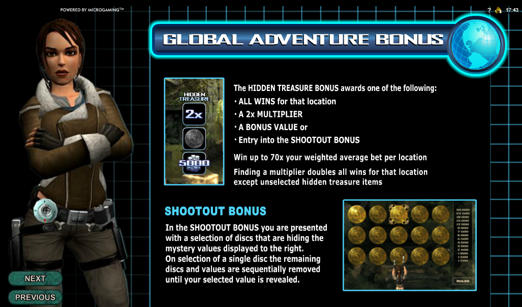 Открытие бонусной игры являет собой особую составляющую игры с оригинальной сюжетной линией. Здесь Ларе Крофт предстоит побывать в столицах различных стран мира, сражаясь со злодейкой Амандой, и собирать части древнего артефакта-меча. Игровой процесс способен увлечь как новичков, так и опытных игроков. А благодаря прекрасной графике и музыкальному сопровождению играть онлайн в данный слот — одно удовольствие.